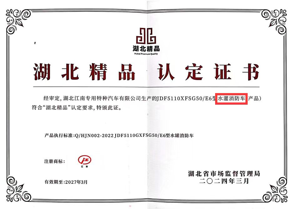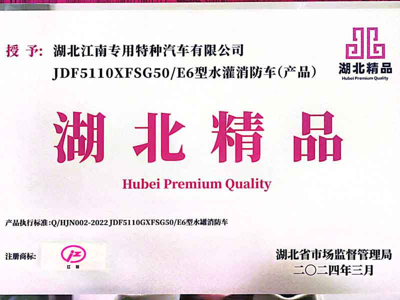 江南JDF5110GXFSG50/E6型水罐消防車獲得“湖北精品”榮譽(yù)稱號(hào)