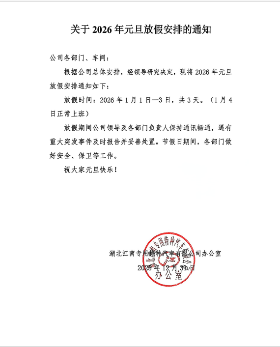 湖北江南公司2026年元旦放假安排通知